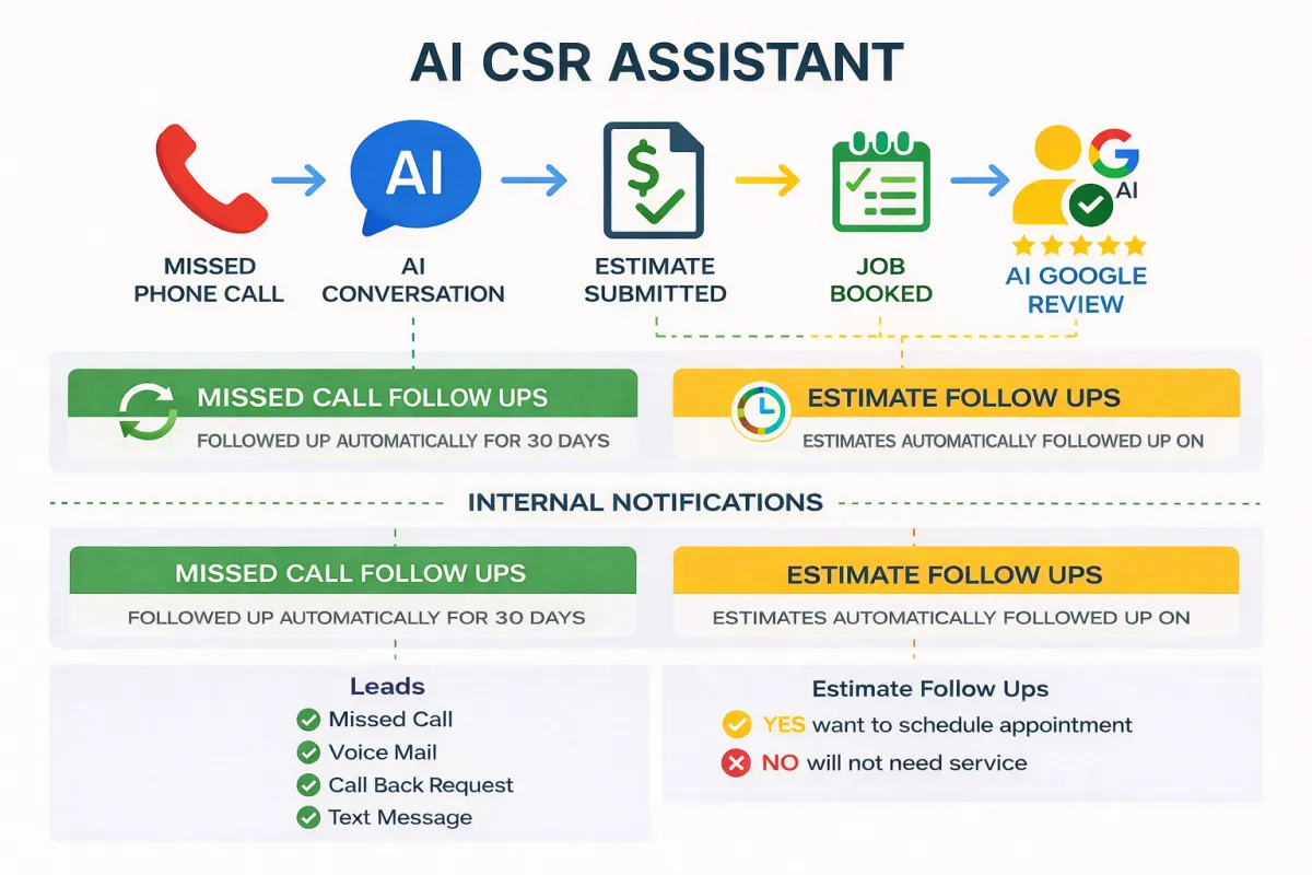 a 24/7/365 solution that answers phone calls, handles customer questions, captures key details, delivers instant estimates, books jobs on the spot, and follows up for 30 days with the goal to turn every call into a paying customer.